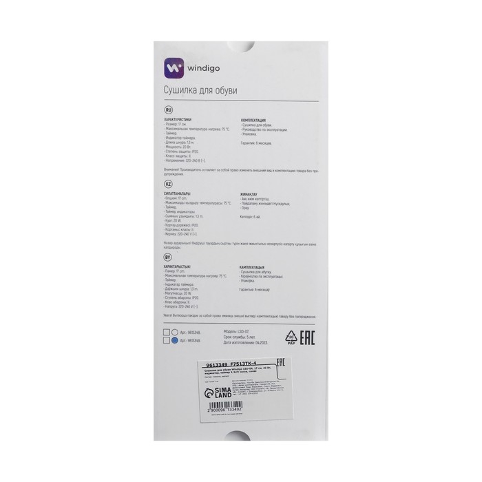 Сушилка для обуви Windigo LSO-07, 17 см, 20 Вт, индикатор, таймер 3/6/9 часов, синяя