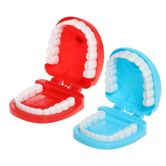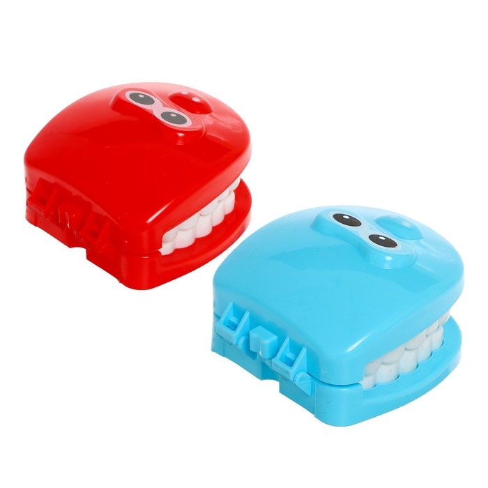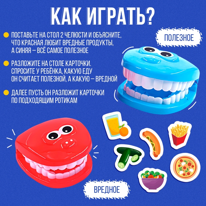 - Поставьте на стол 2 челюсти и объясните, что красная челюсть любит вредные продукты, а синяя — всё самое полезное.
