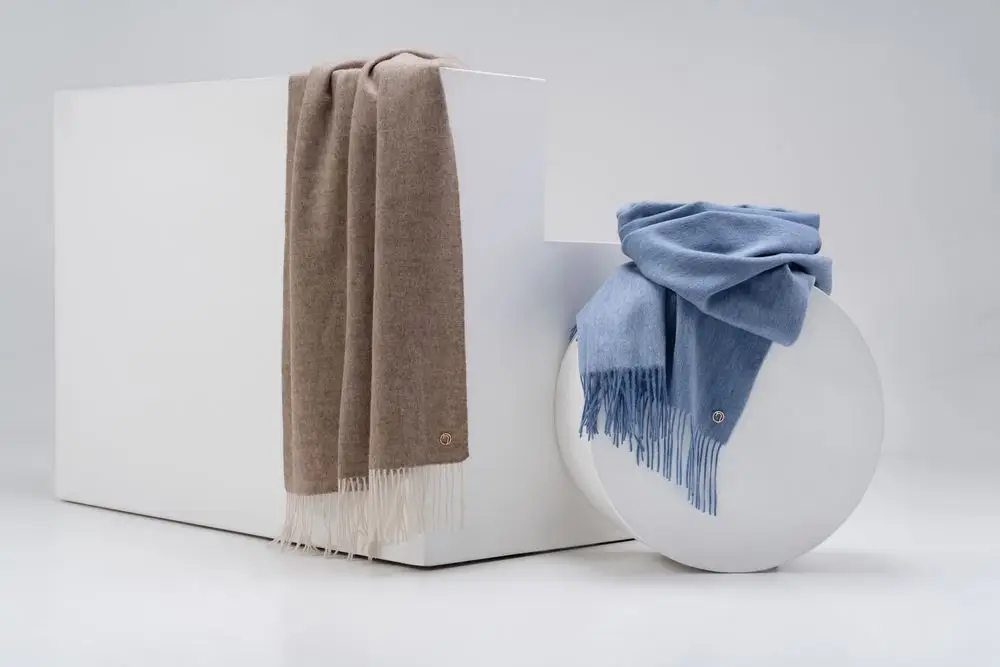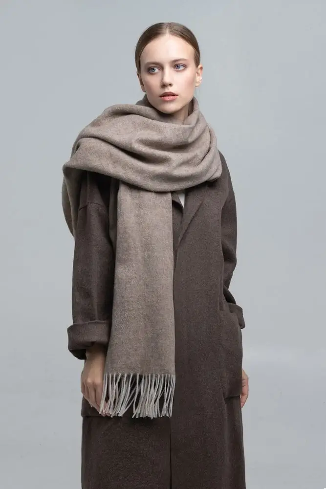Широкий палантин с едва заметным узором плетения открывает простор фантазии — его можно использовать как шарф, головной убор или декоративный элемент для верхней одежды.