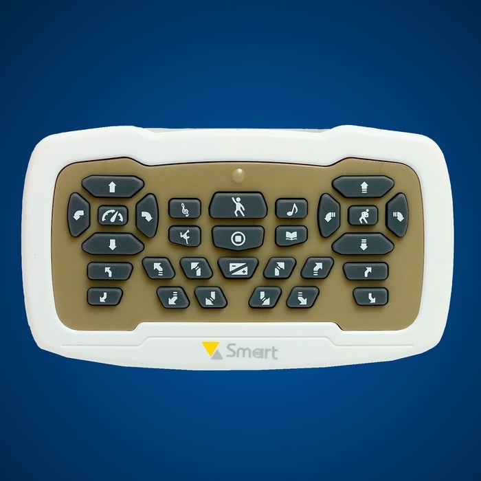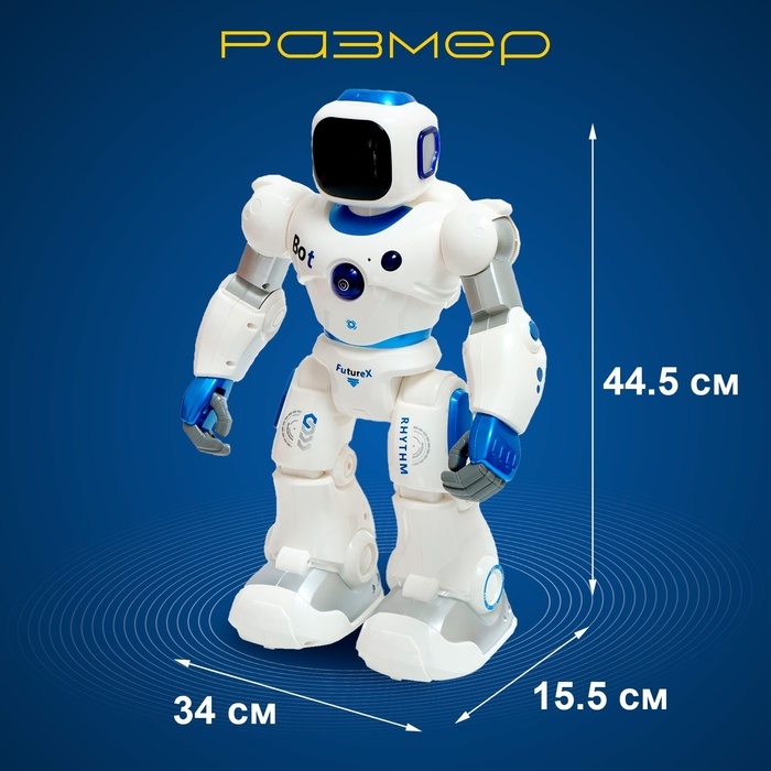 - Управляется с помощью пульта. Пульт оснащен кнопками для управления движением робота, а также кнопками для включения звуковых эффектов и подсветки.