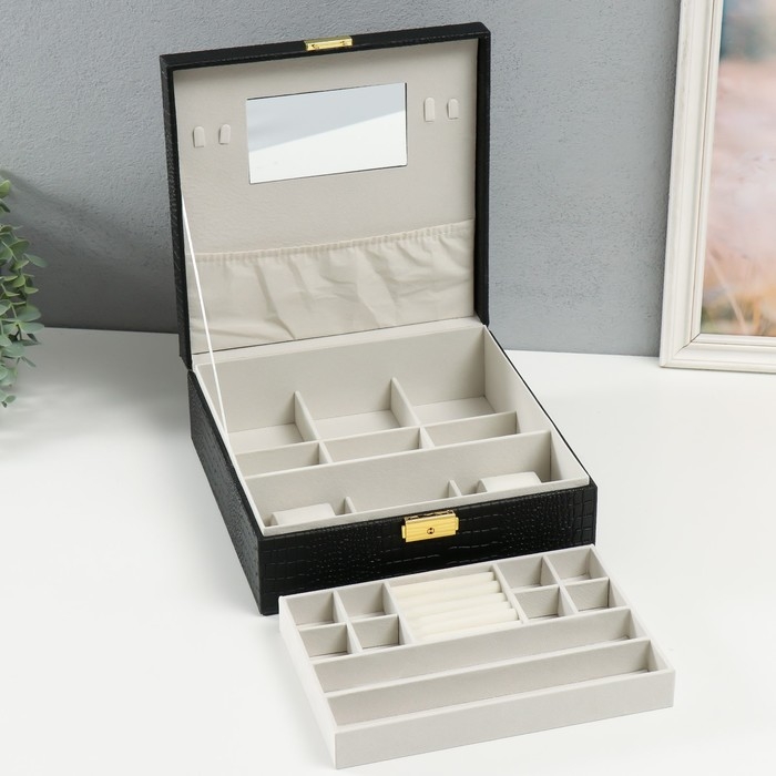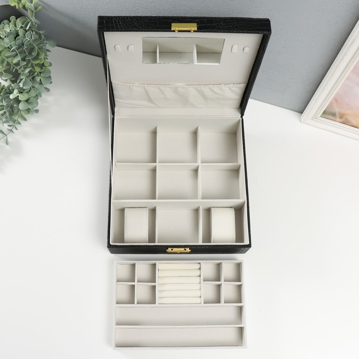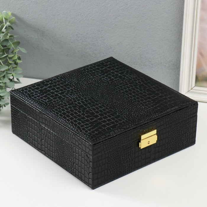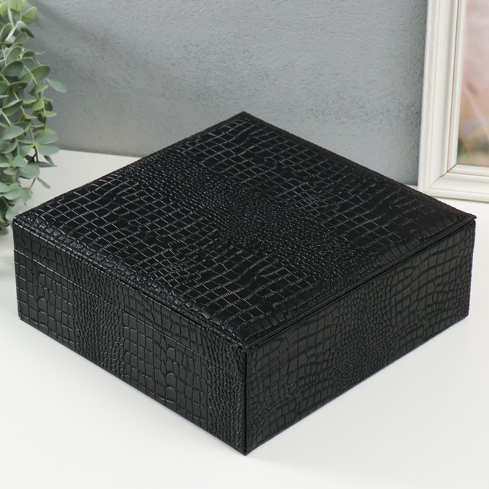 Шкатулка кожзам под часы 2 отделения и бижутерию "Кожа крокодила" чёрная 26х26,5х10 см