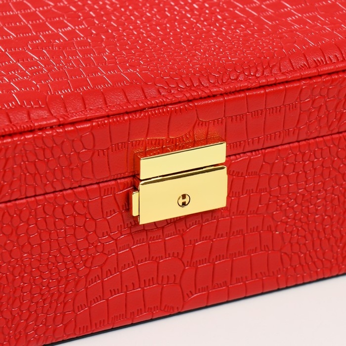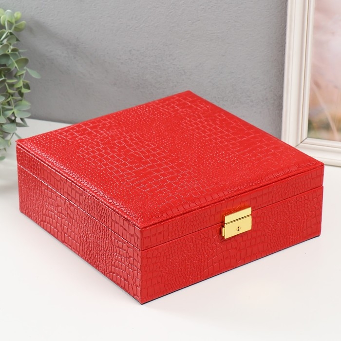 Шкатулка кожзам под часы 2 отделения и бижутерию "Кожа крокодила" красная 26х26,5х10 см
