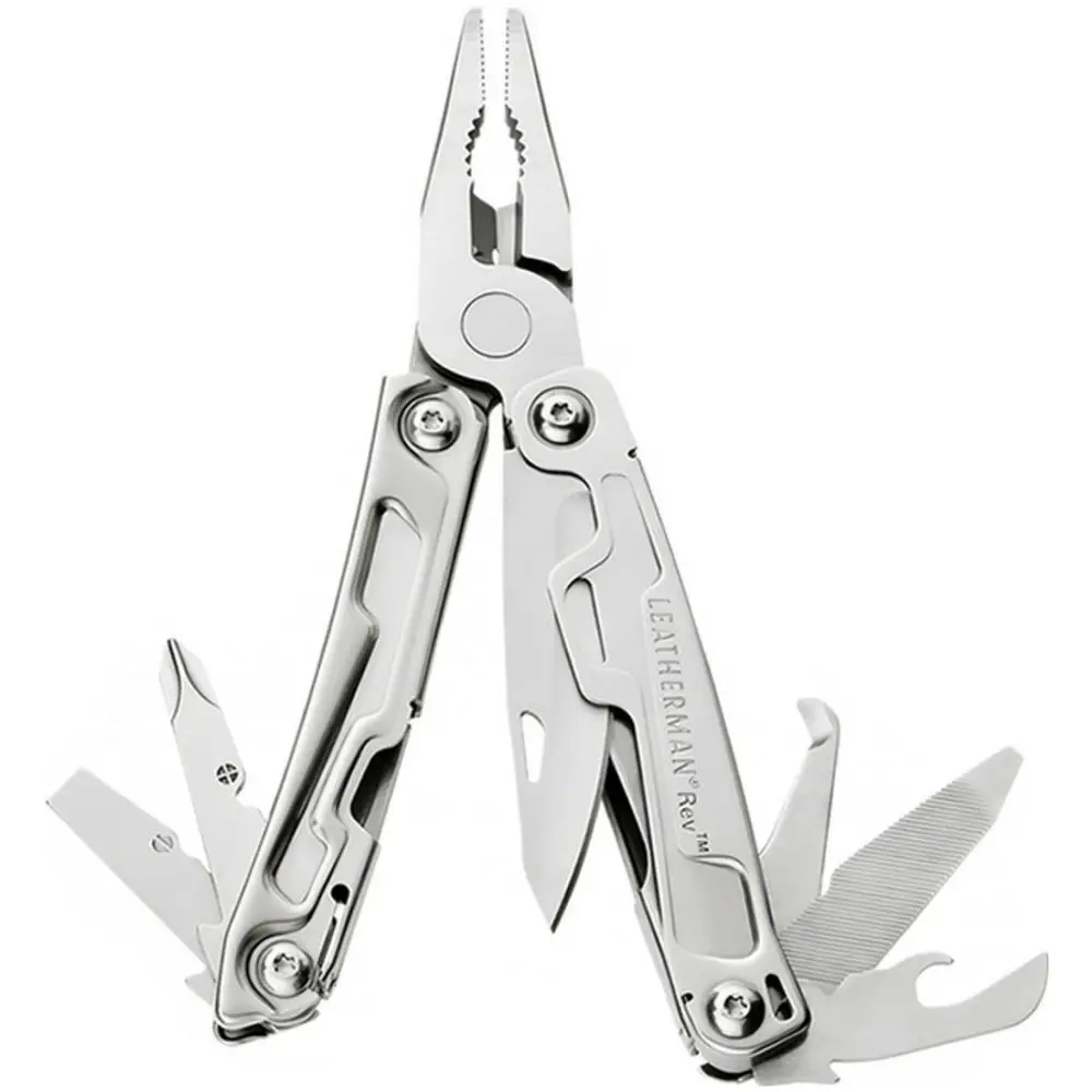Мультитул Rev считается бюджетной моделью с 14 инструментами в арсенале. Конструкция и рукояти отлиты из высококачественной нержавеющей стали, что обеспечивает долгий срок эксплуатации. Набор вместил прямой клинок из стали 420 HC, усиленные кусачки, которые разрезают стальной трос, набор отверток, универсальные пассатижи с тонкими острогубцами и крюк для вскрытия упаковок.