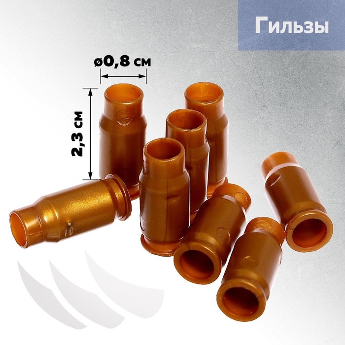 - В наборе: автомат, гильзы — 8 штук, пули — 10 штук.