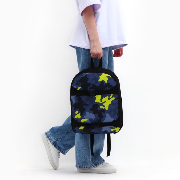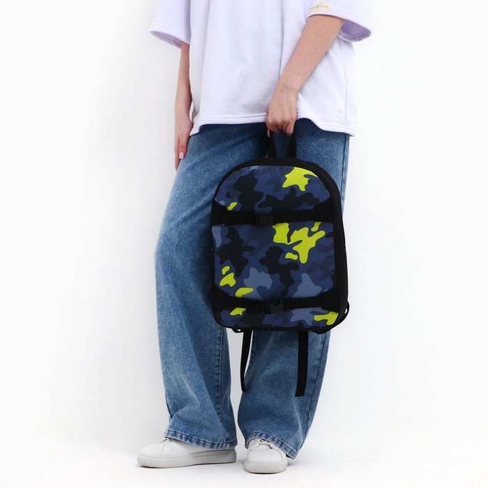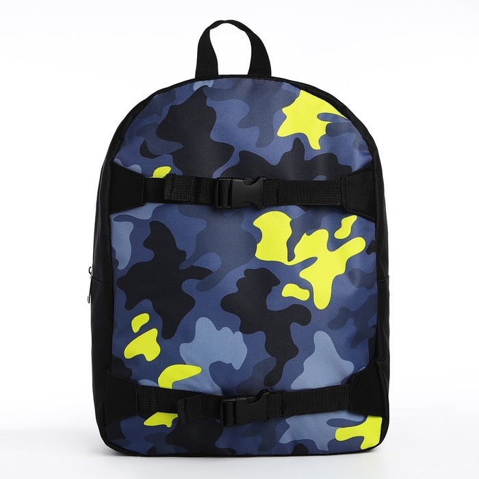 Рюкзак школьный текстильный с креплением для скейта «Камуфляж», 38х29х11 см, цвет чёрный, отдел на молнии