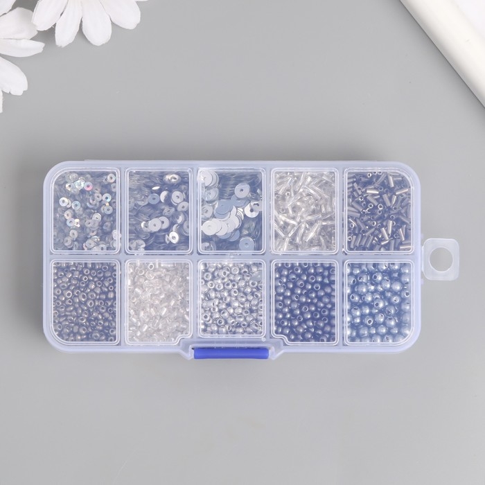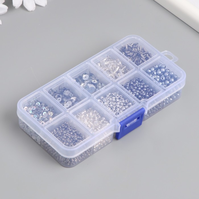 Бисер стекло 8/0, 12/0 в шкатулке "Серебро" бусины, стеклярус и пайетки 13х6,5х2,3 см
