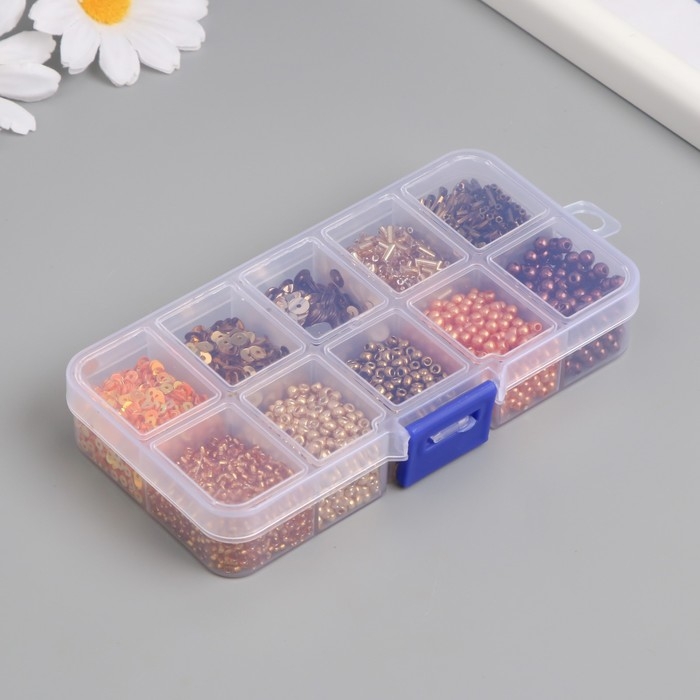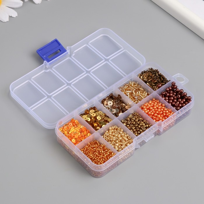 Бисер стекло 8/0, 12/0 в шкатулке "Золото" бусины, стеклярус и пайетки 13х6,5х2,3 см