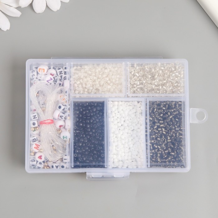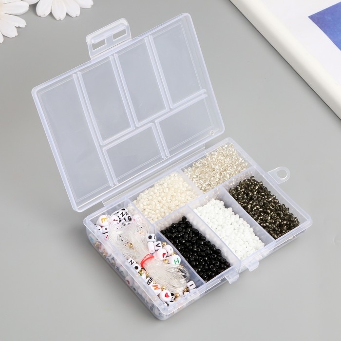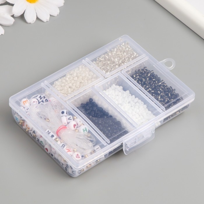 Бисер стекло 8/0 в шкатулке "Чёрно-белый" бусины + нить 0,8 мм 5 м 12х8,4х2,2 см