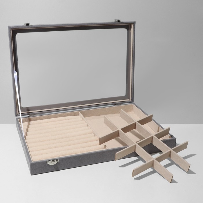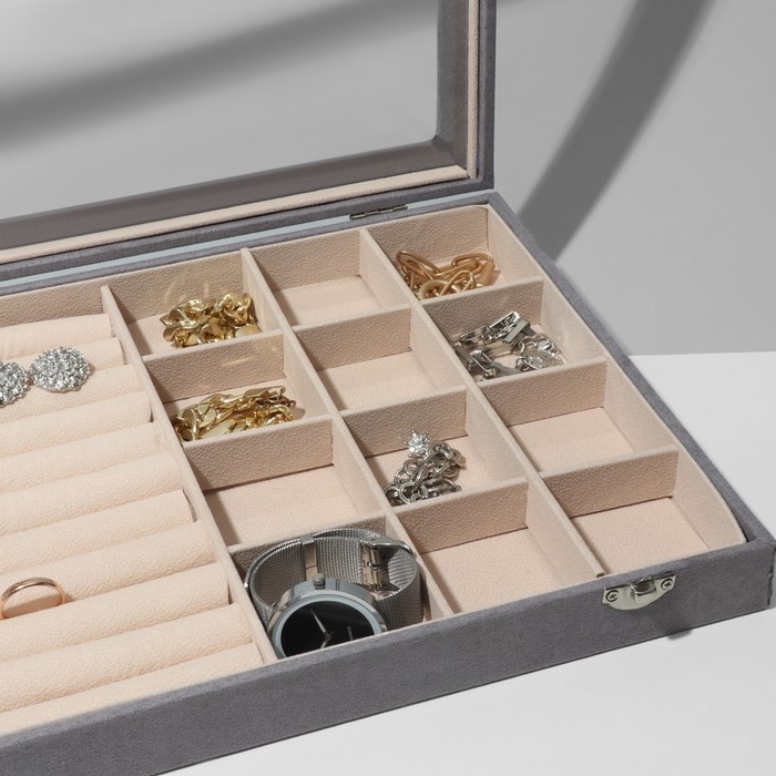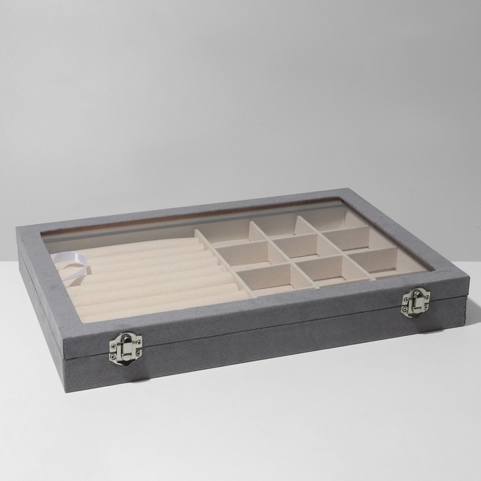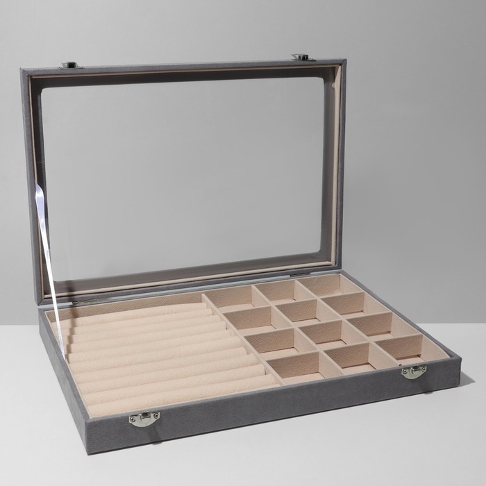 Подставка для украшений «Шкатулка» 10 рядов, 12 ячеек, флок, 35×24×4,5, стеклянная крышка, цвет серо-бежевый