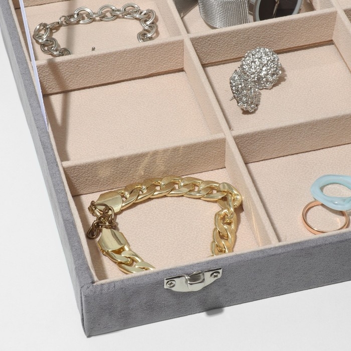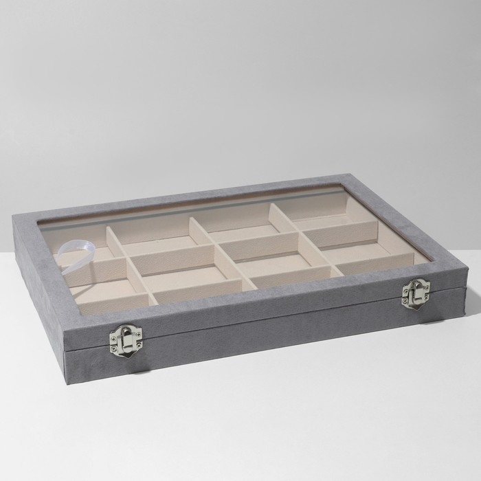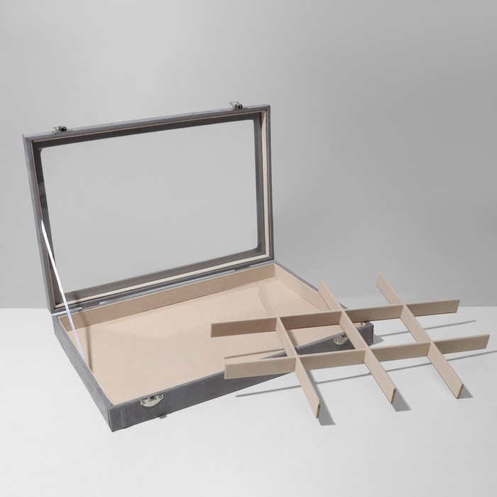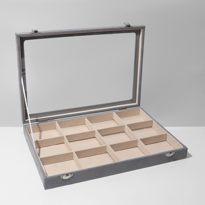 Подставка для украшений «Шкатулка» 12 ячеек, флок, 35×24×4,5, стеклянная крышка, цвет серо-бежевый