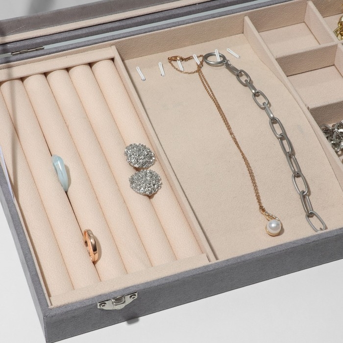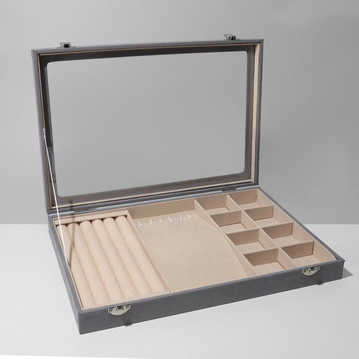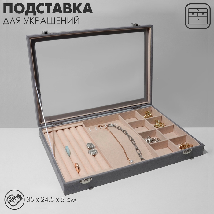 Подставка для украшений «Шкатулка» 5 рядов, 6 крючков, 8 ячеек, флок, 35×24,5×5, цвет серо-бежевый