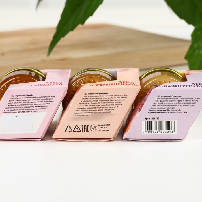 Набор «Счастья в каждом моменте»: мёд гречишный, мёд разнотравье, мёд таёжный, 3 шт. х 30 г.