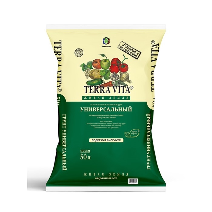 Грунт "Живая Земля Универсальный" объемом 50 л представляет собой полностью готовый питательный грунт, разработанный компанией Terra Vita специально для выращивания различных видов овощных и ягодных культур, цветов и рассады. Этот грунт обладает рядом преимуществ, которые делают его идеальным выбором для садоводов и огородников.Преимущества использования грунта "Живая Земля Универсальный":1. Улучшение всхожести семян и приживаемости рассады. Благодаря оптимальному составу и структуре грунта, процент всхожести семян увеличивается, а рассада успешно приживается после пересадки.2. Повышение урожайности и качества овощей и плодов. Грунт обогащен комплексом минеральных удобрений, которые способствуют улучшению качества и урожайности выращиваемых культур.3. Ускорение роста, развития и созревания овощей и корнеплодов. Благодаря оптимальной текстуре и питательному составу грунта, растения активно развиваются и быстро достигают зрелости.4. Улучшение вкусовых и питательных свойств продукции. Выращенные на этом грунте овощи, ягоды и цветы отличаются насыщенным вкусом и высоким содержанием питательных веществ.5. Восстановление плодородия почвы и естественного биоценоза. Использование грунта "Живая Земля Универсальный" способствует восстановлению плодородия почвы и созданию благоприятной среды для развития полезных микроорганизмов.6. 100% натуральные компоненты. Грунт изготавливается из натуральных материалов без добавления химических веществ, что делает его экологически чистым продуктом.7. Нейтральная кислотность и рыхлая текстура. Грунт имеет оптимальную кислотность и рыхлую текстуру, что обеспечивает наилучшее качество урожая и удобство при выращивании.Грунт "Живая Земля Универсальный" представляет собой надежный выбор для тех, кто стремится получить высокие урожаи овощей, ягод и цветов с минимальными затратами времени и усилий. Благодаря своим свойствам и составу, этот грунт является отличным помощником для садоводов и огородников, обеспечивая здоровый рост и развитие растений, а также богатый урожай высокого качества.