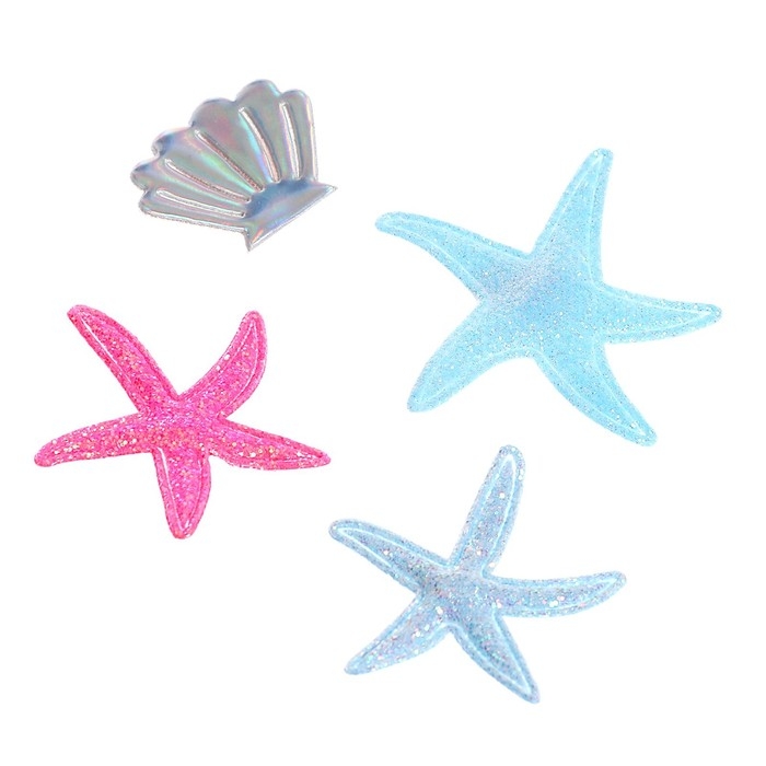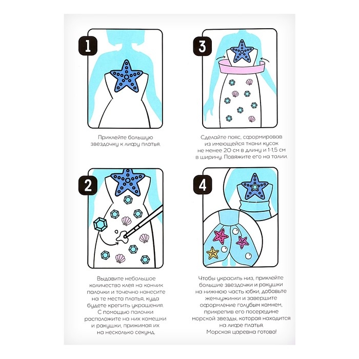 - Чтобы украсить низ, приклейте большие звёздочки и ракушки на подол. Затем добавьте жемчужинки и завершите оформление голубым стразом. Прикрепите его в середину морской звезды, которая находится на лифе платья.
