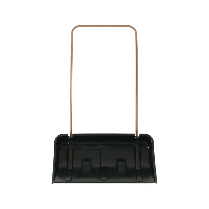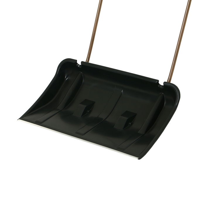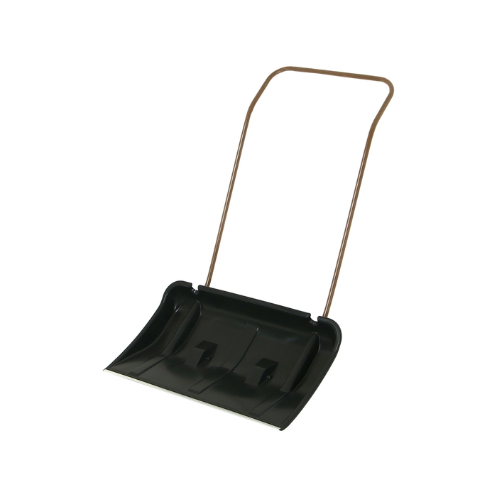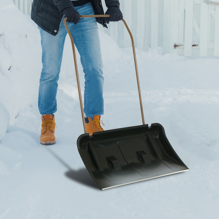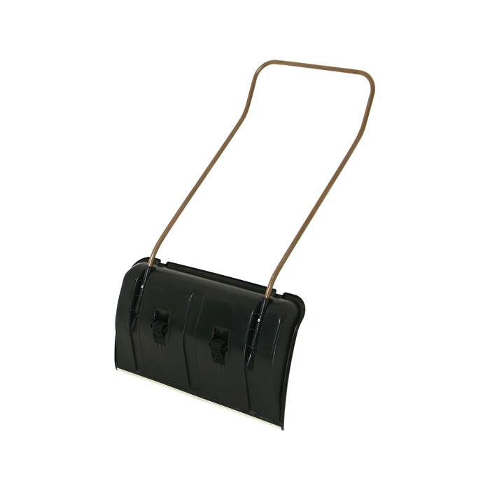 За счёт широкого ковша (75 см) движок подходит для расчистки от снега больших территорий. П-образная ручка позволяет увеличить силу воздействия на плоскость. Металлическая планка и рёбра жёсткости усиливают прочность рабочей поверхности и сохраняют её форму. С помощью колёс уборка территории будет в разы легче, так как вы сможете без усилий передвигать движок.