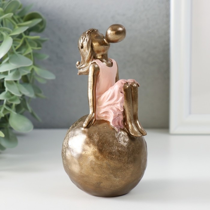 Сувенир полистоун "Девочка в розовом платье, надувает пузырь, на шаре" бронза 7х7х13,5 см