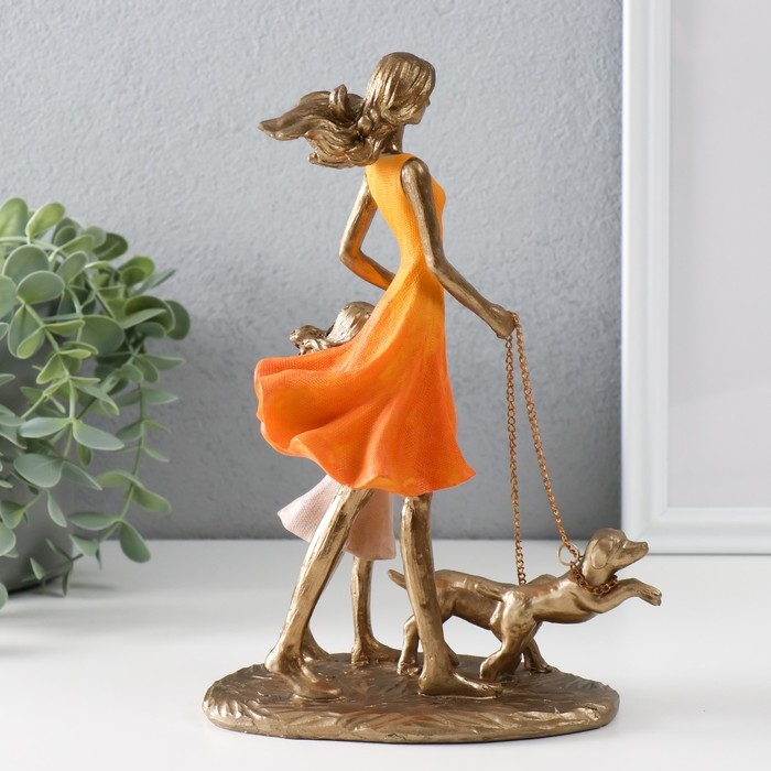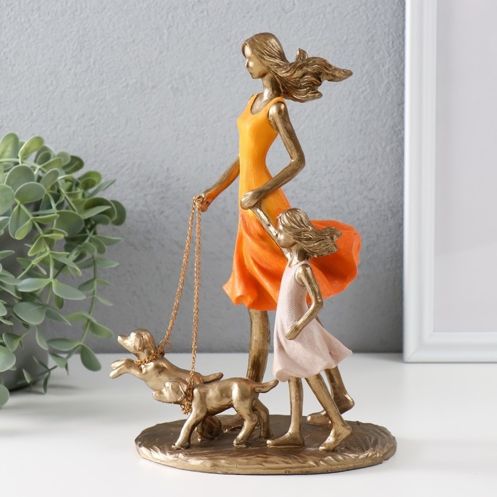 Сувенир полистоун "Мама с дочкой на прогулке с собаками" бронза, оранжевый 16х9,5х24 см