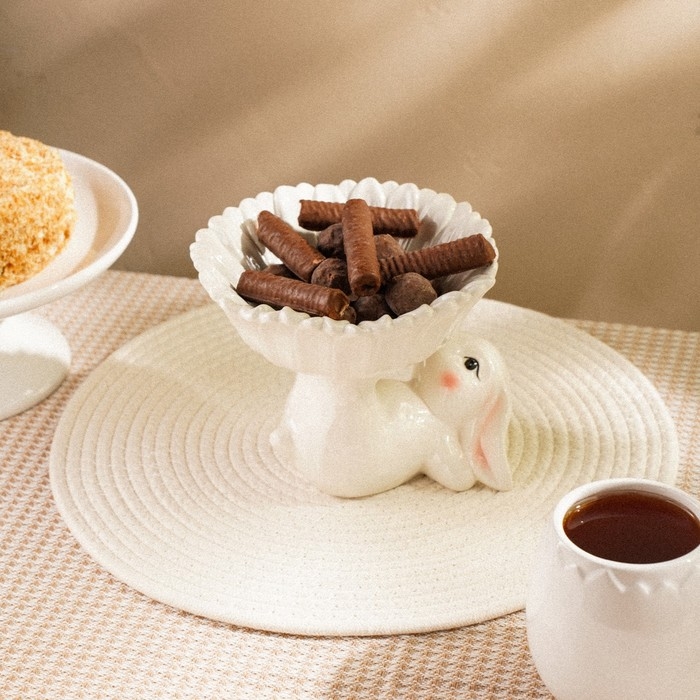Эта очаровательная конфетница с фигуркой лесных кроликов добавит уют и тепло в ваш дом. Созданная из высококачественной керамики, она не только прекрасно выглядит, но и отличается долговечностью. Гладкая текстура и белоснежный цвет делают её универсальной для любой кухни или гостиной, а отсутствие рисунков позволяет легко сочетать её с другой посудой.