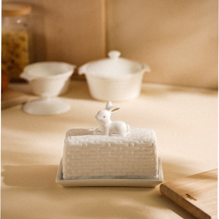Маслёнка выполнена из высококачественной керамики, что обеспечивает её долговечность и практичность в использовании. Благодаря прямоугольной форме, она идеально подходит для хранения стандартного куска масла, создавая удобство в каждодневном использовании. А нежный белый цвет и элегантный дизайн в виде лесных кроликов добавят нотку сказочности и очарования вашему завтраку.
