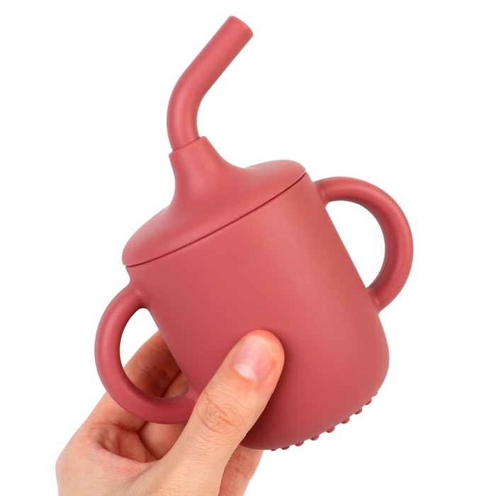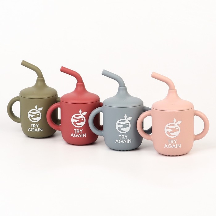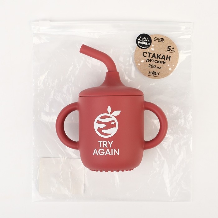 Поильник с трубочкой детский силиконовый «Try again», 200 мл., с ручками, цвет вишневый