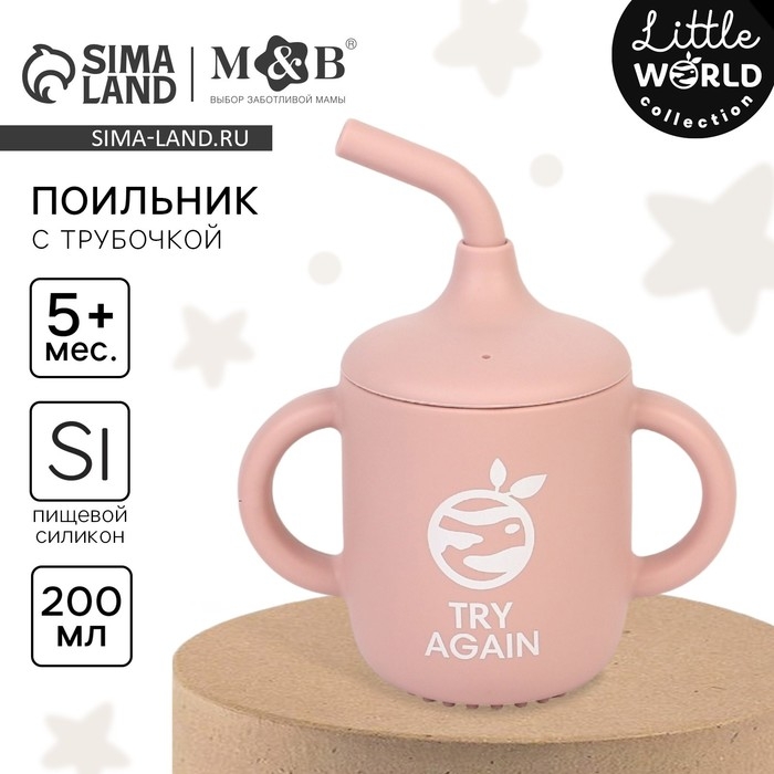 Поильник с трубочкой детский силиконовый «Try again», 200 мл., с ручками, цвет розовый