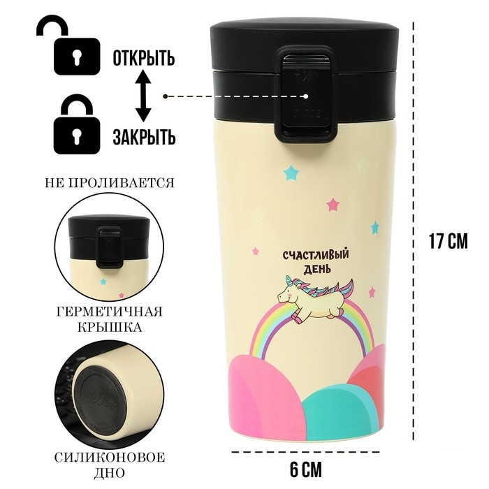 Термокружка, 380 мл, Style "Счастливый день", сохраняет тепло 8 ч, с ситечком