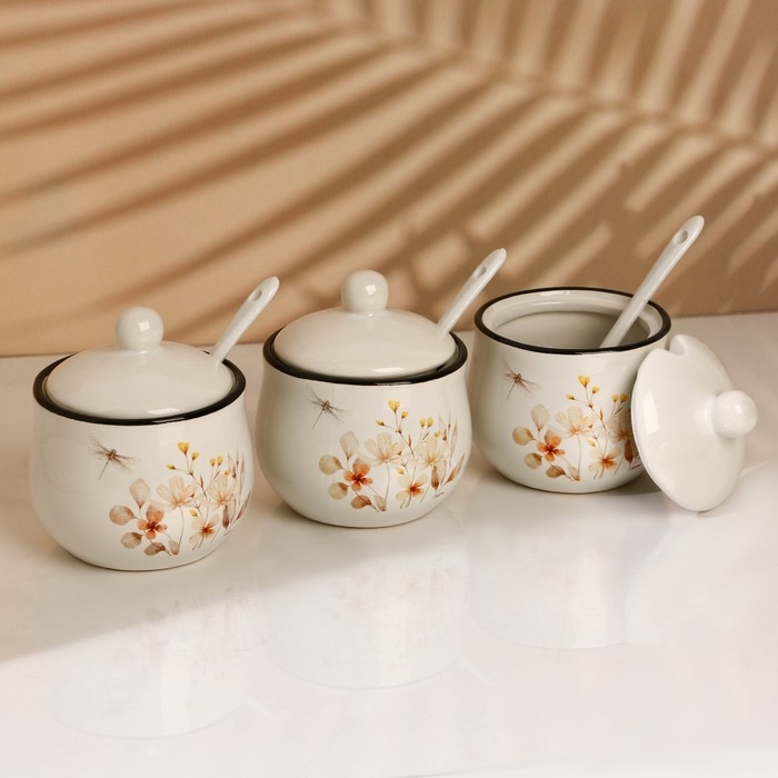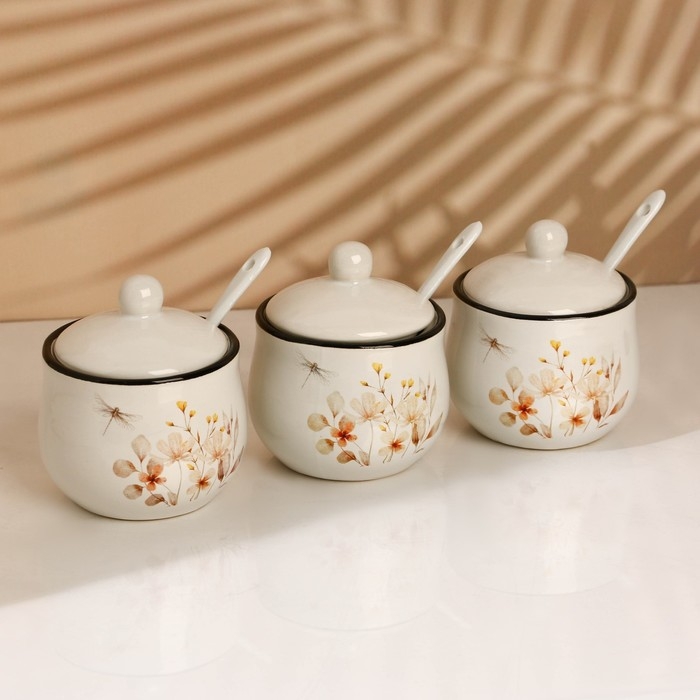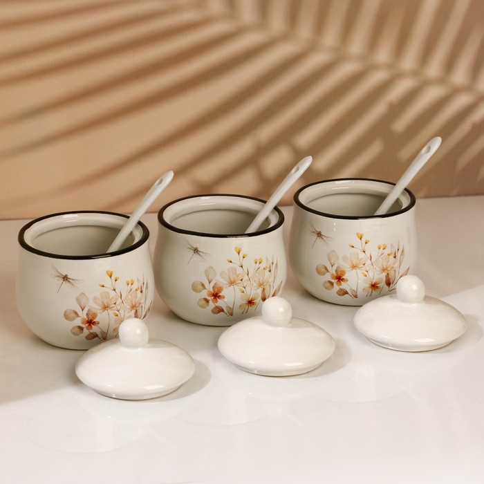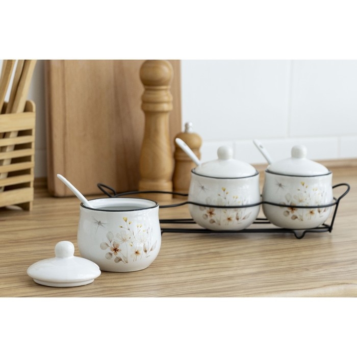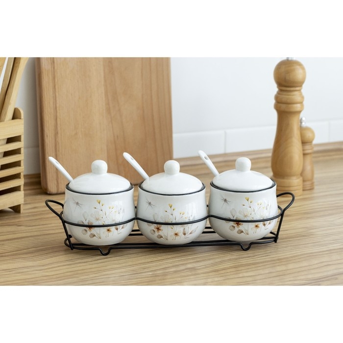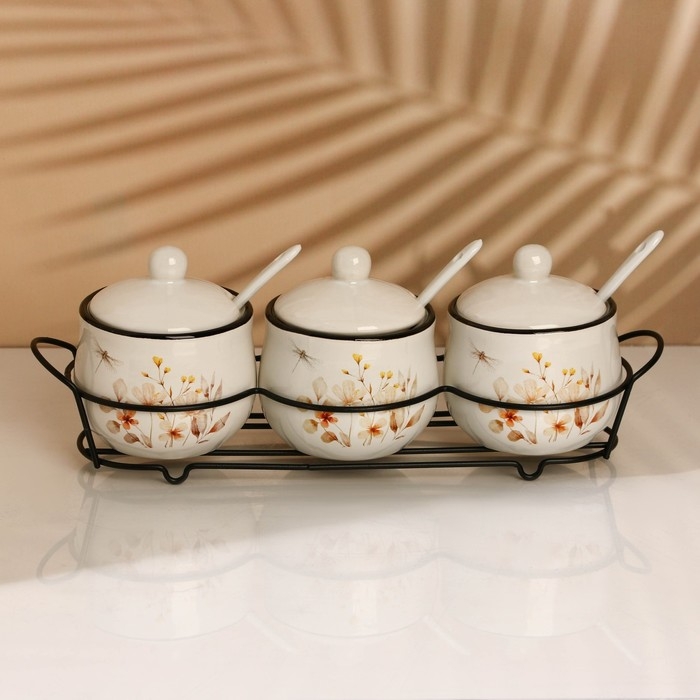 Банки керамические для специй на металлической подставке «Цветы», 200 мл, 3 шт