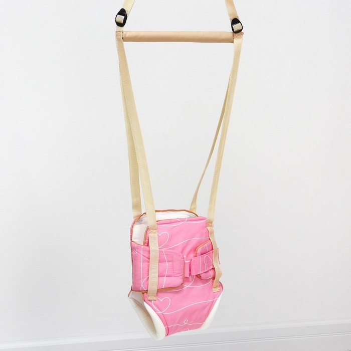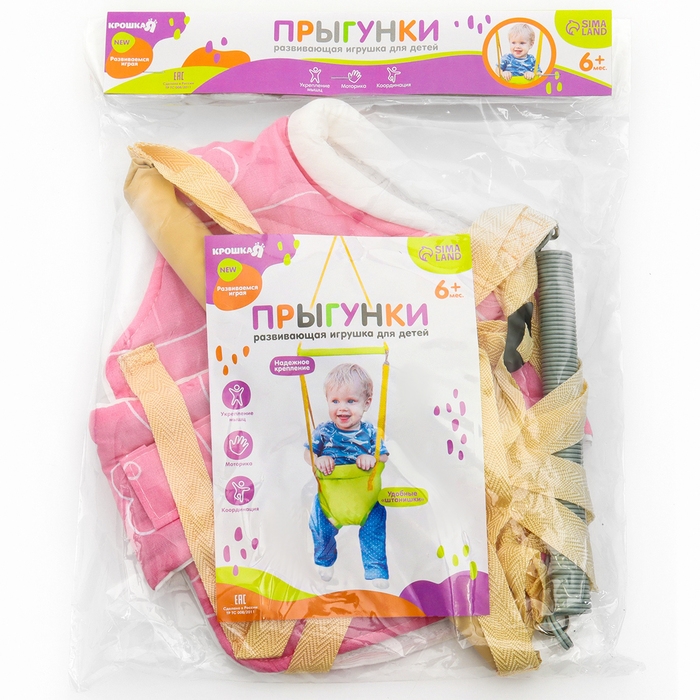 Посадите полугодовалого кроху в сиденье-штанишки. Малышу понравится активная игра, он будет подпрыгивать и качаться. Размер посадочного места можно настроить индивидуально, а за перекладину ребёнку будет удобно держаться.
