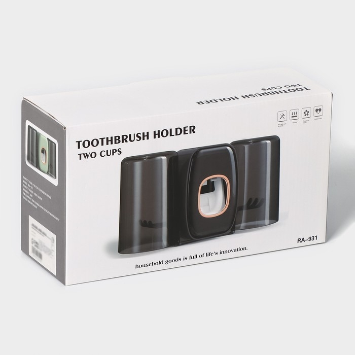 Держатель для зубных щёток с выдавливателем для зубной пасты, стакан 2 шт, 20×10,2×6,2 см, цвет чёрный