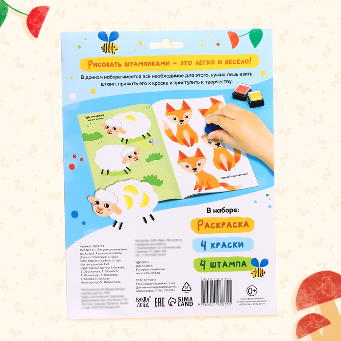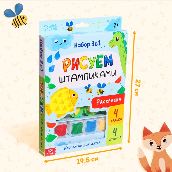 Набор 3 в 1 «Рисуем штампиками», раскраска, 4 краски, 4 штампа