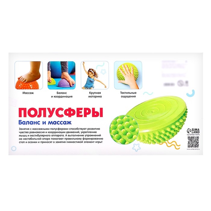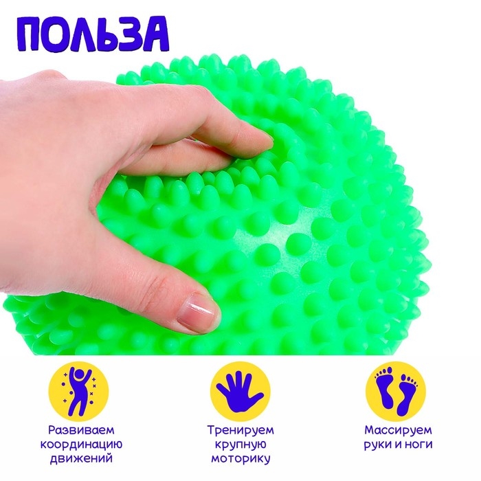 Развивающий набор «Полусферы» создан специально для малышей от 3 лет. Занятия с массажными полусферами способствуют развитию чувства равновесия и координации движений, укреплению мышц и вестибулярного аппарата. А выполнение упражнений на нестабильной опоре помогают правильному формированию стоп и осанки и привносят в занятия гимнастикой элемент игры.