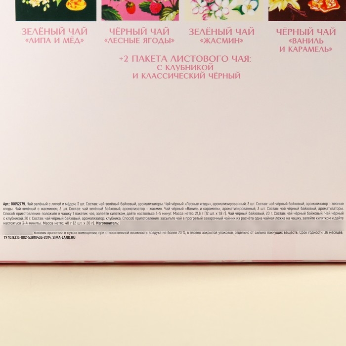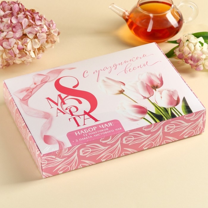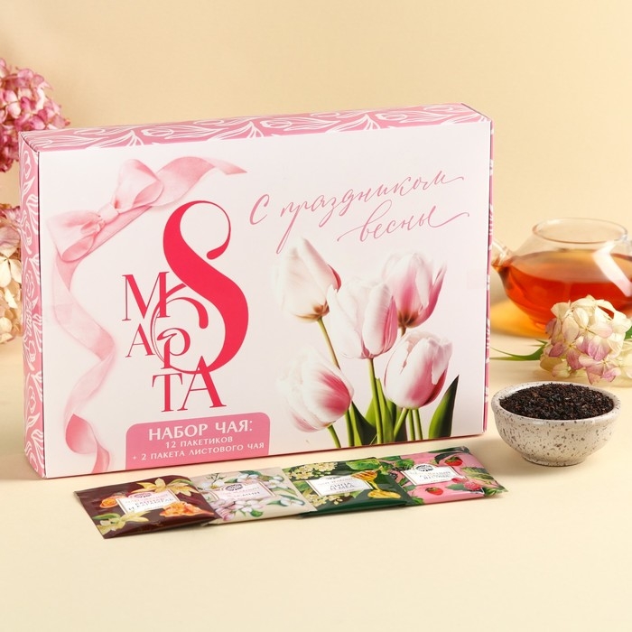 Набор с чаем «С праздником весны», весовой чай 40 г (2 шт. х 20 г)., чай в пакетиках 21,6 (12 шт. х 1,8 г).