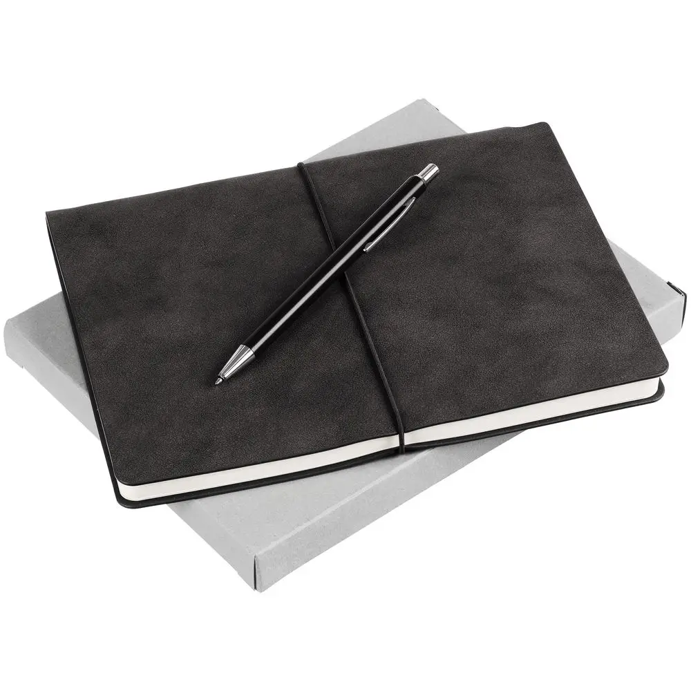 Ежедневник из искусственного материала, напоминающего замшу, и изящная ручка, которая удобно прячется за обложку ежедневника.