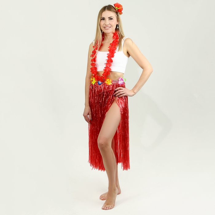 Гавайский набор «Тропики»: юбка, зажим, венок, цвет красный
