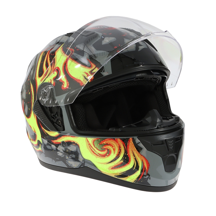 Прогрессивная вентиляция с регулировками уровня обдува. Ползунки для удобного подъема визора без контакта со стеклом. Внутренняя съемная подкладка выполнена из качественных материалов и не имеет резких, ярко выраженных запахов. Шлем изготовлен из качественного ABS пластика, который в свою очередь обладает долговечностью, высокой механической прочностью.