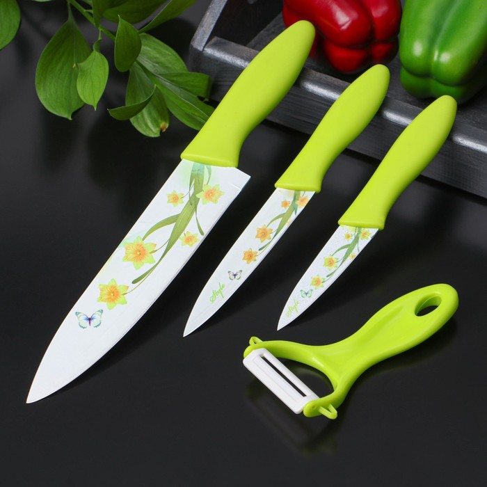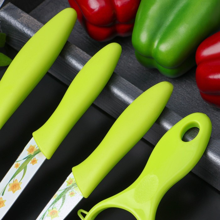 Набор кухонных принадлежностей Доляна, 4 предмета: 3 ножа с антиналипающим покрытием, лезвие 8,5 см, 12 см, 20 см, овощечистка, цвет зелёный