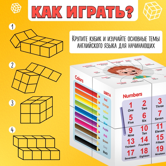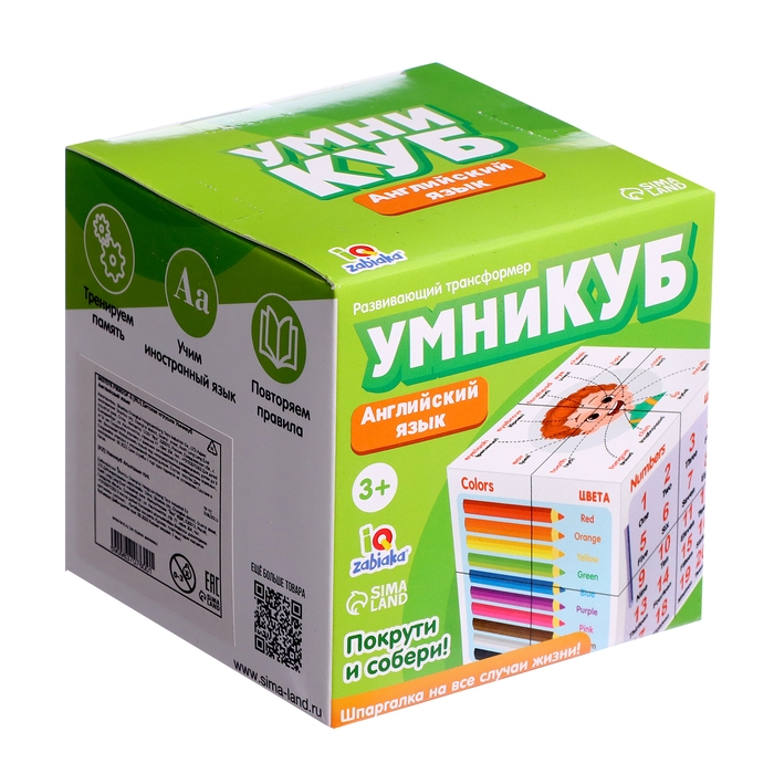 «Умникуб: Английский язык — развивающий трансформер для малышей. С такой игрушкой ребёнок в игровой форме выучит основные темы английского языка. Яркие картинки привлекут внимание непоседы, а таблицы и примеры, изображённые на нём, помогут повторить и закрепить знания.