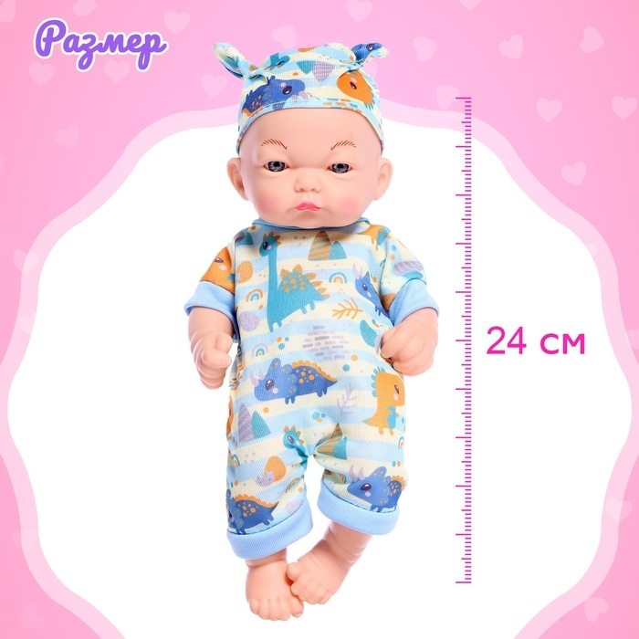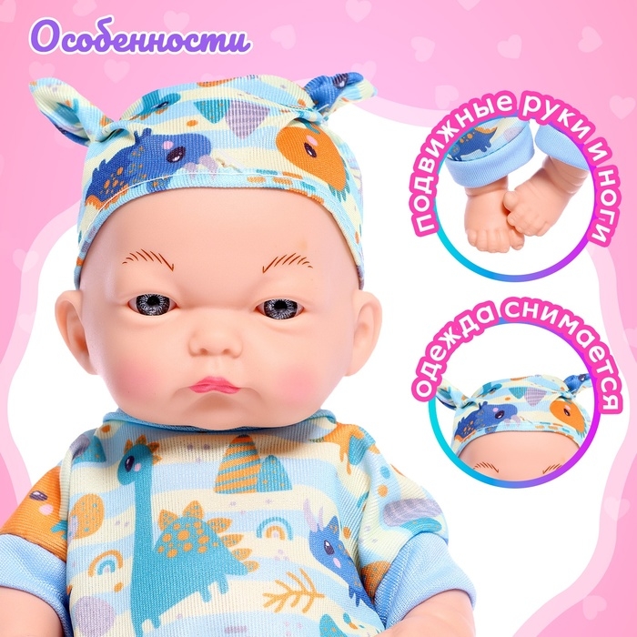 Этот милый пупс станет отличным подарком для ребенка. Он одет в стильный комбинезон с изображениями динозавриков, который можно снимать и менять на другие наряды. Этот симпатичный малыш высотой 24 см приглашает в увлекательные игры, которые развивают воображение и тренируют важные навыки.