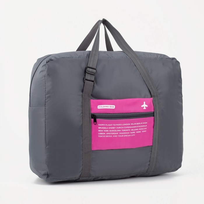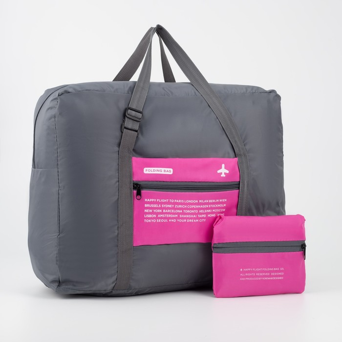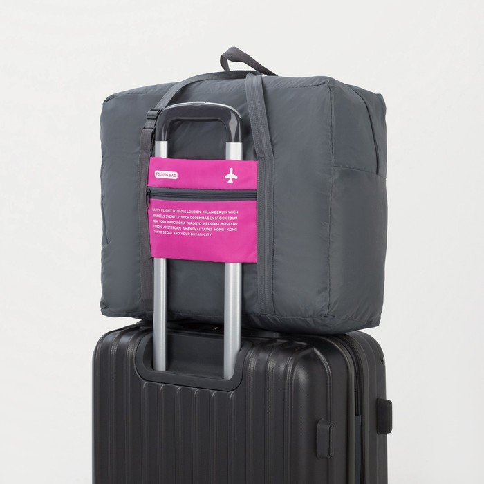Сумка дорожная на молнии, складная в косметичку, наружный карман, держатель для чемодана, цвет серый/розовый