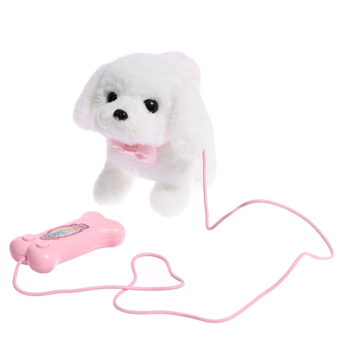 Управляйте щенком с помощью кнопочек на поводке и наблюдайте, как он забавно шагает вперёд, бегает и лает.