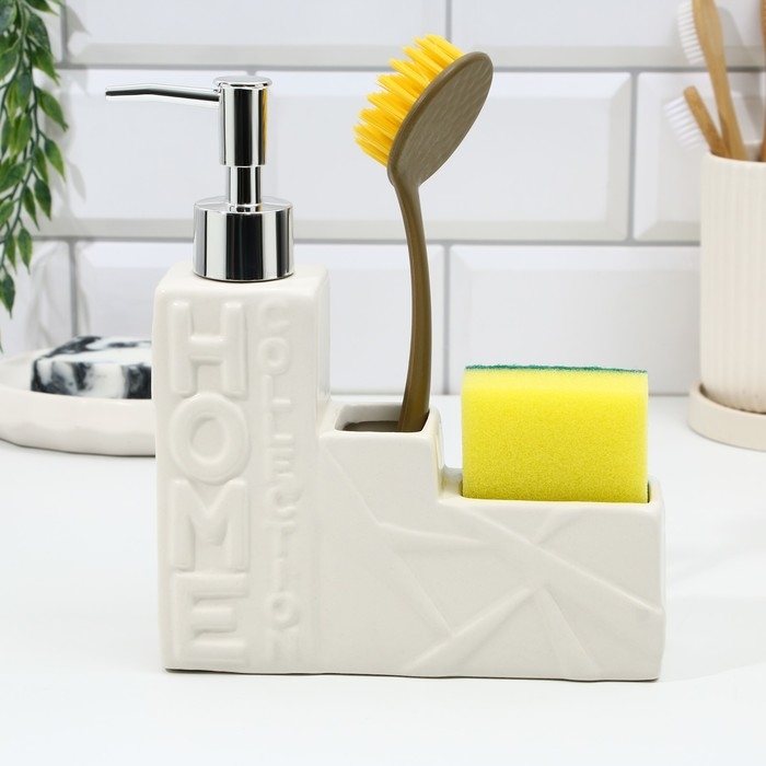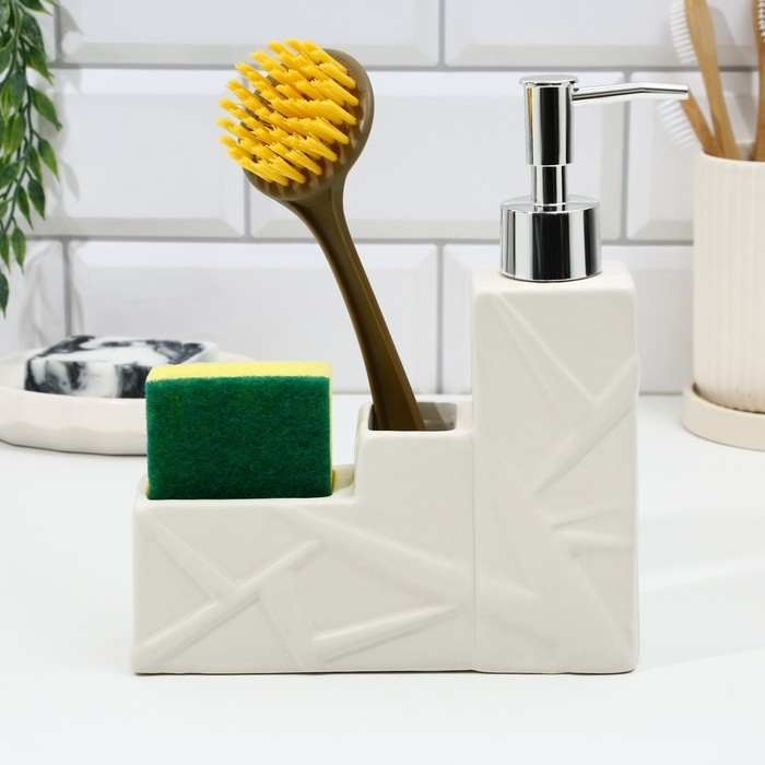 Дозатор для жидкого мыла с губкой и щеткой для посуды, белый ,16 х 12 х 4 см.