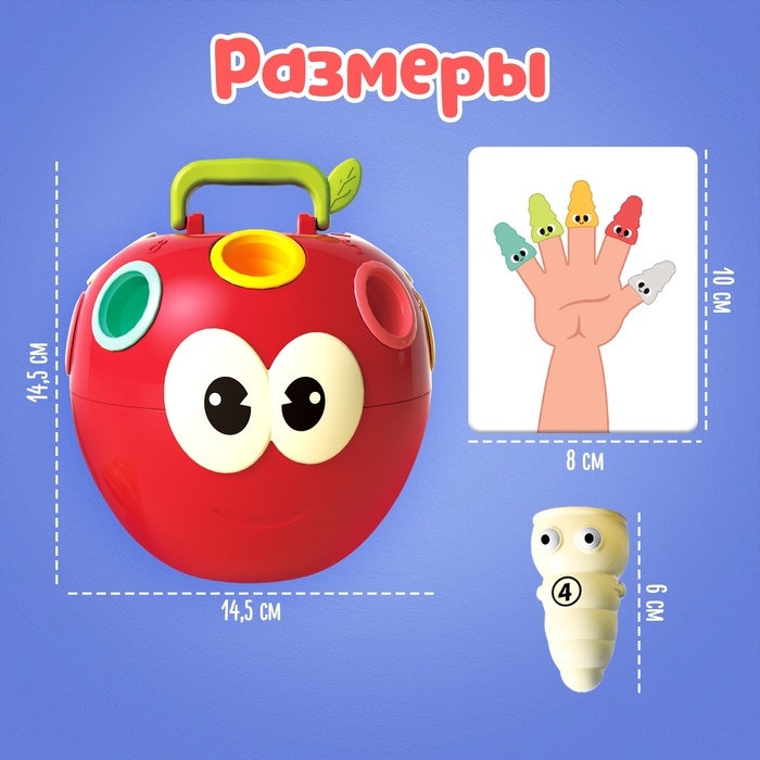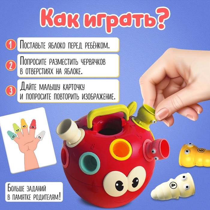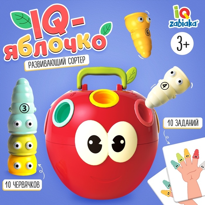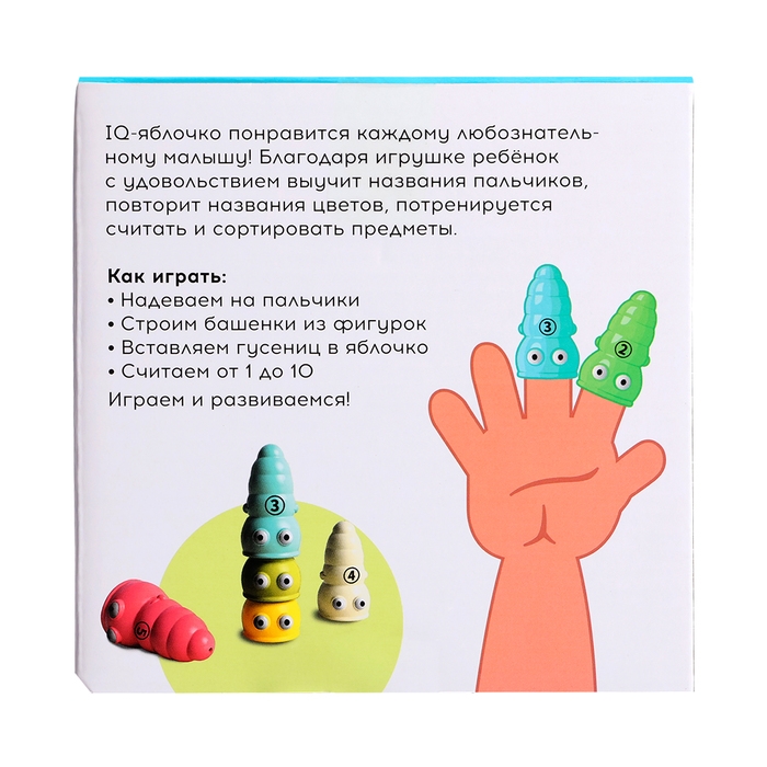 Развивающий сортер «IQ-яблочко» поможет малышам от 3 лет выучить названия пальчиков, повторить названия основных цветов, научиться считать до 10 и сортировать предметы.