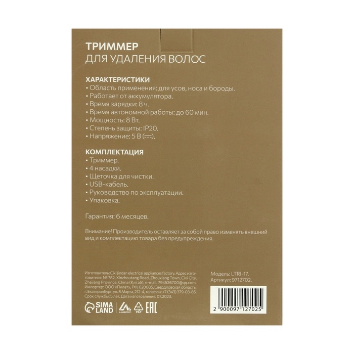 Триммер для волос Luazon LTRI-02, для носа/ушей, АКБ, золотистый