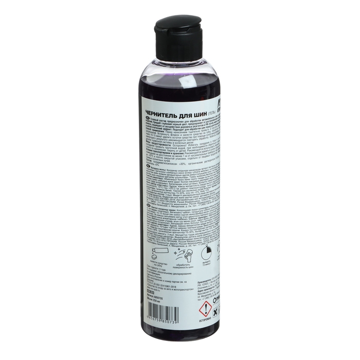 - Чернитель шин "Blackener Gel" гель 250 мл. Предназначен для обработки автомобильных шин и других резиновых изделий. Придаёт глубокий черный цвет, предохраняет от растрескивания и преждевременного износа, защищает от воздействия дорожных реагентов и УФ-лучей, имеет водоотталкивающий и антистатический эффект. Подходит для обработки шин перед длительным хранением. Эффект: Придает шинам глубокий черный цвет, имеет водоотталкивающий и антистатический эффект