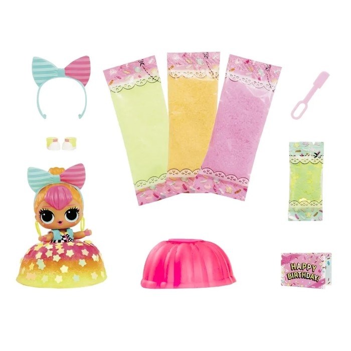 - В наборе: мини-кукла, наряд, обувь, аксессуары, форма для платья-торта, 3 пакетика со смесью, 1 — с блёстками.