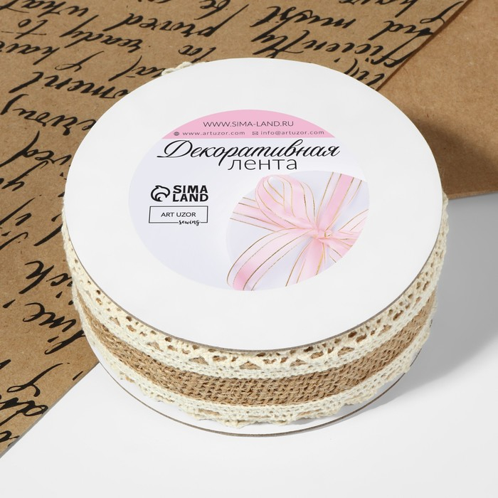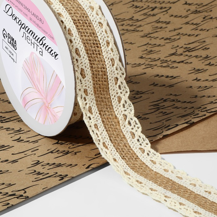 Лента из джута «Кружево», натуральная, 35 мм, 4,5 ± 0,5 м, цвет бежевый/белый