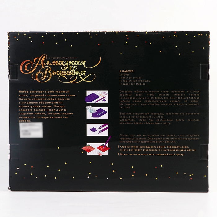 Вам предстоит разложить кристаллики карандашом по пронумерованной схеме. Холст с клеевым покрытием будет надёжно удерживать стразы.