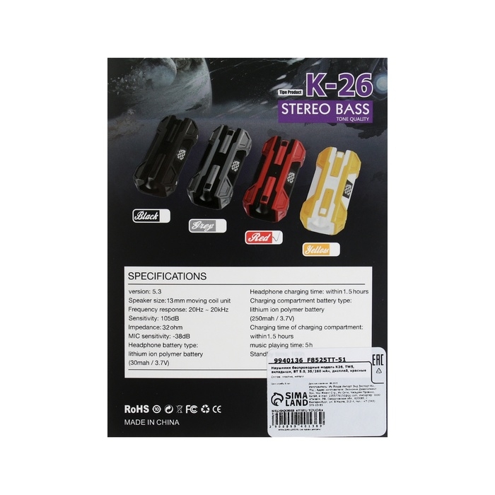Наушники беспроводные K26, TWS, вкладыши, BT 5.0, 35/260 мАч, дисплей, красные
