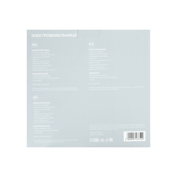 Электровафельница Luazon WV-02, 750 Вт, венские вафли, антипригарное покрытие, белая
