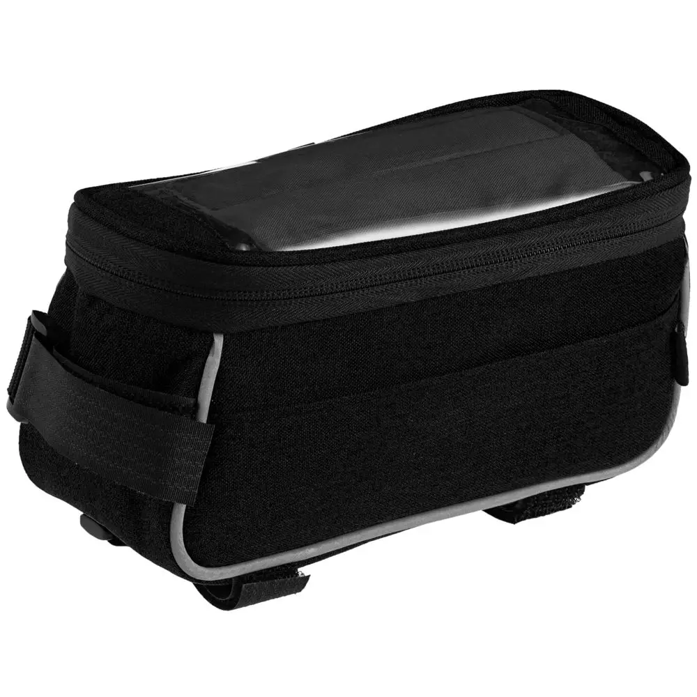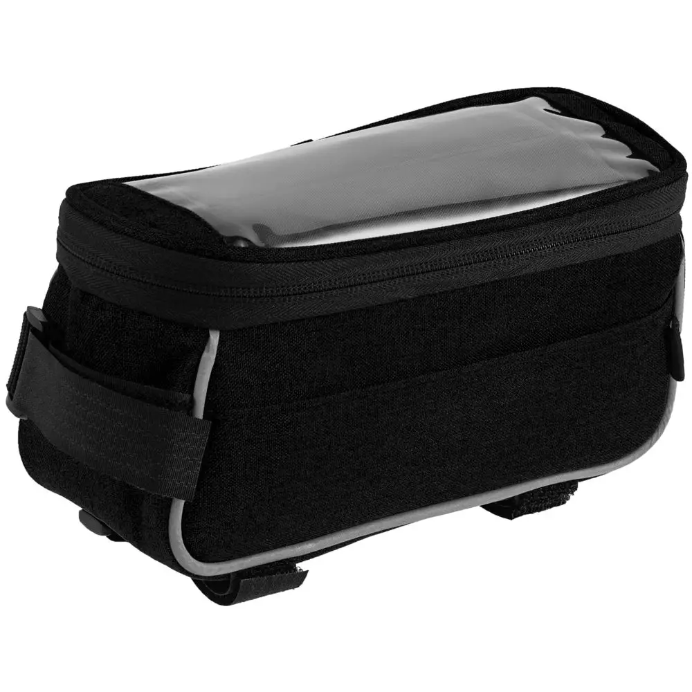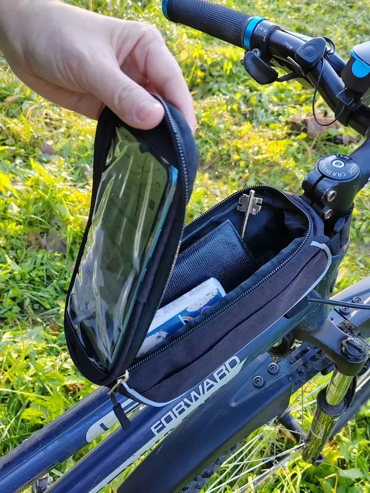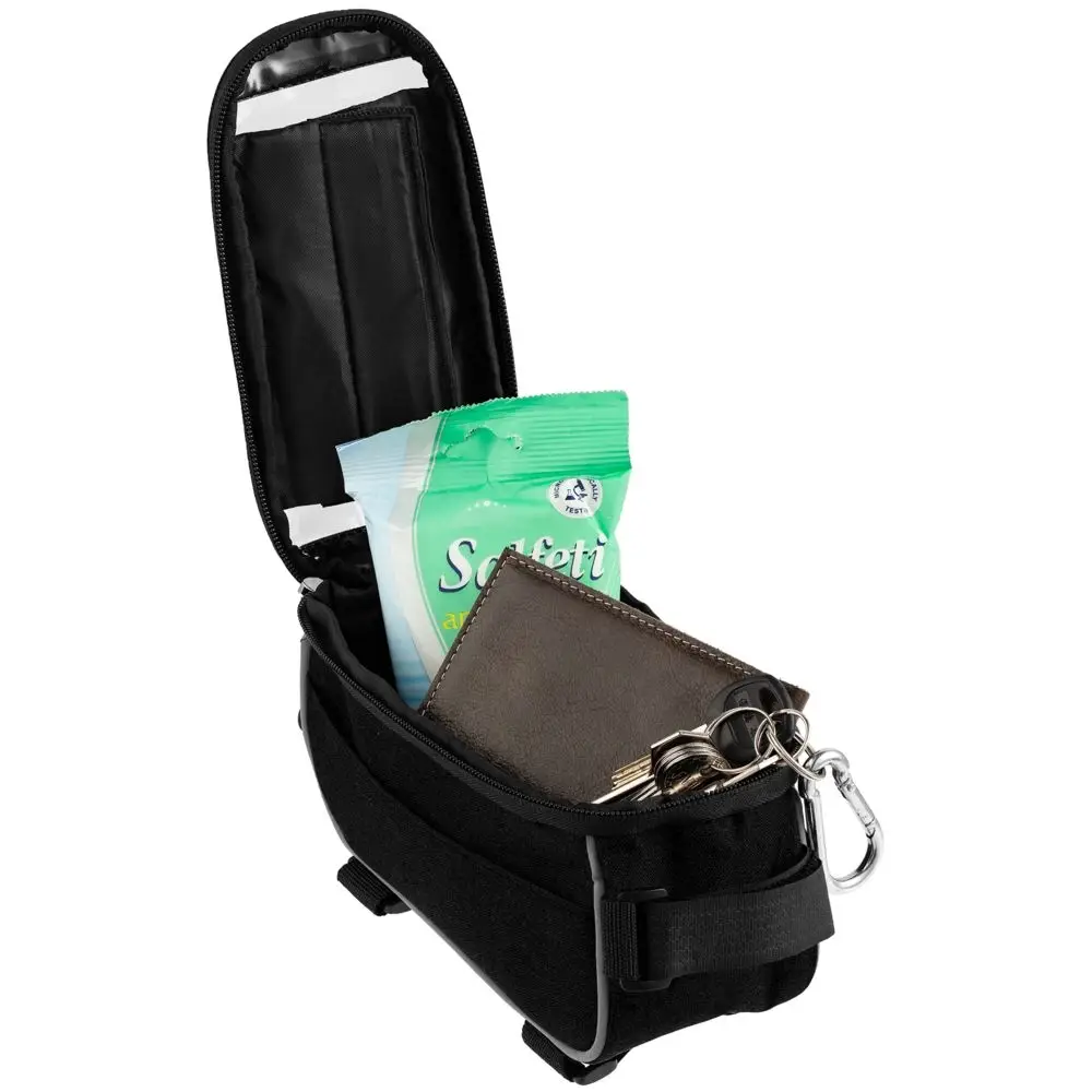 В основное отделение поместятся самые необходимые на велопрогулке вещи: кошелек, ключи, салфетки, снеки. На боковой стенке есть прорезиненное отверстие для наушников, а окантовка выполнена из светоотражающего материала.